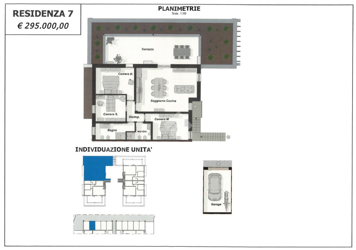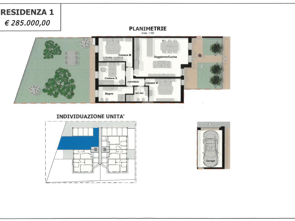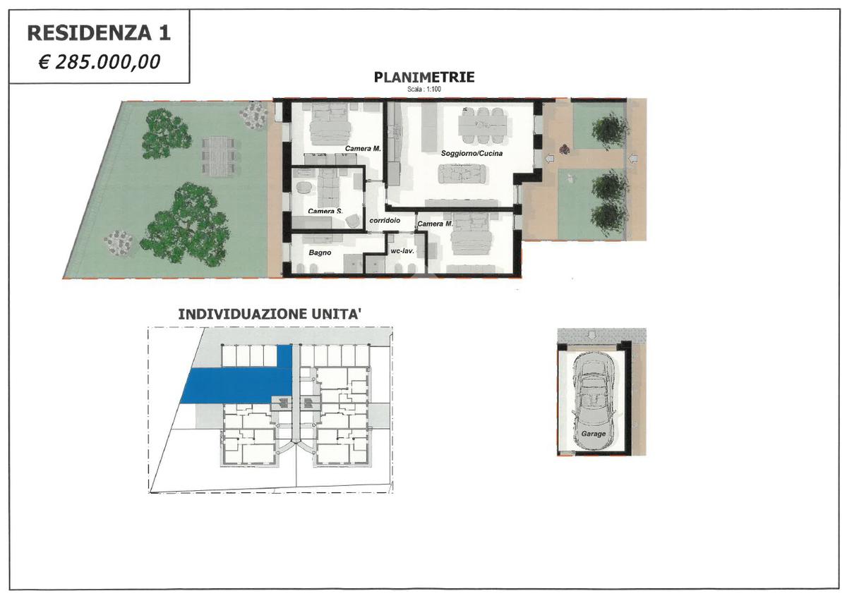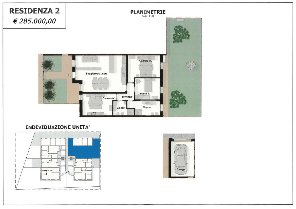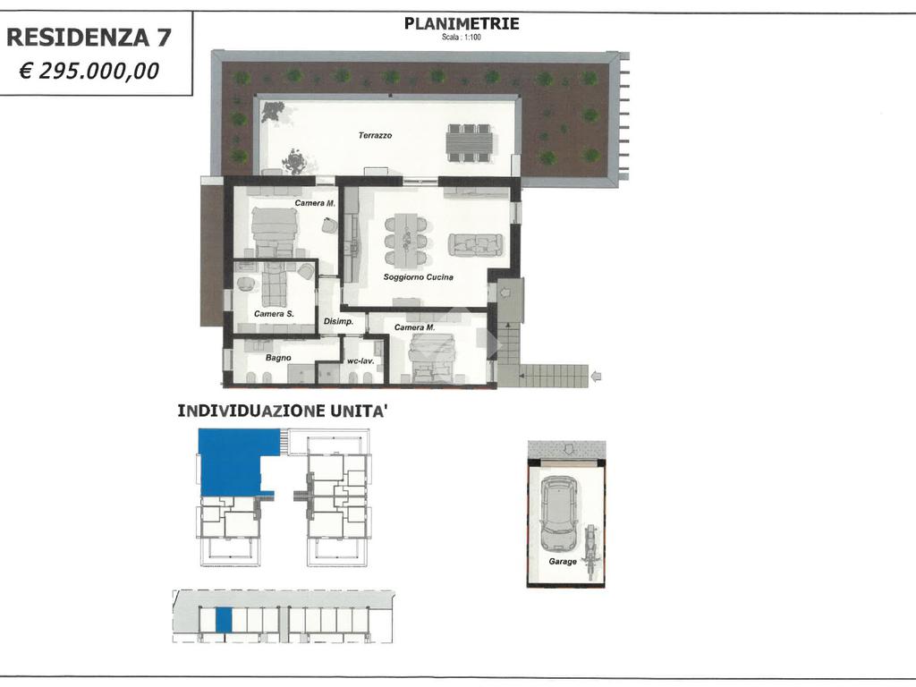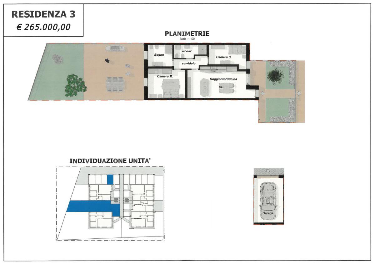 Ogni appartamento è composto da soggiorno con cucina a vista - 2/3 camere da letto - 2 bagni - giardino privato per i piani terra - ampia terrazza per i piani primi - garage singolo e posto auto di proprietà.