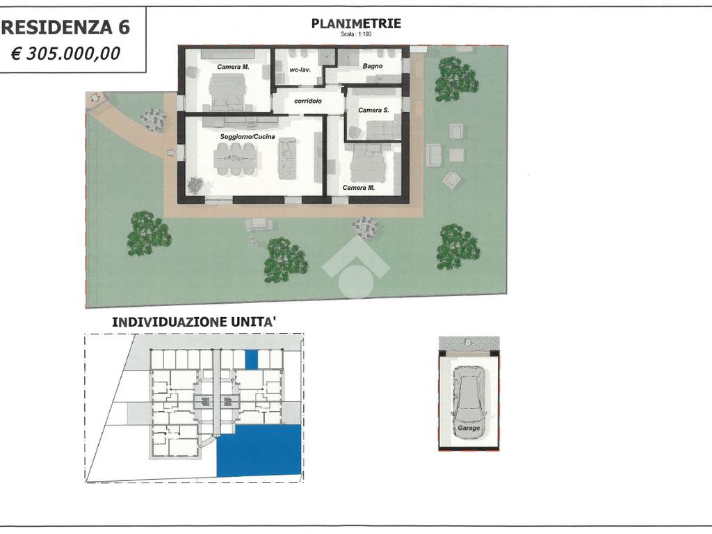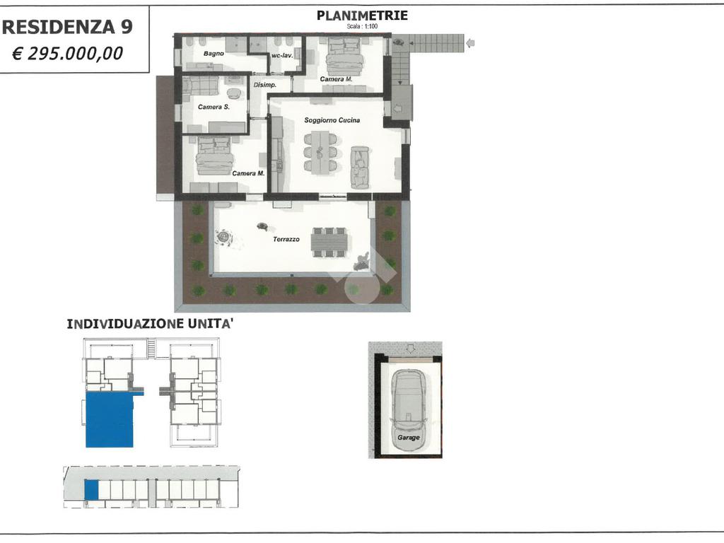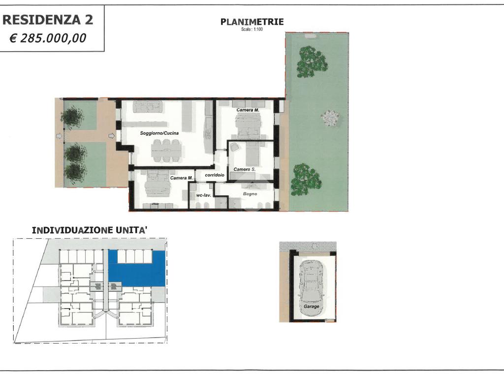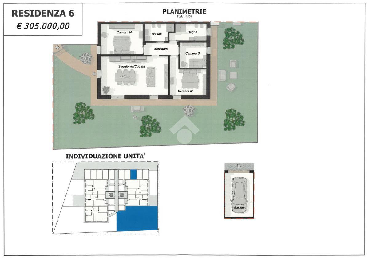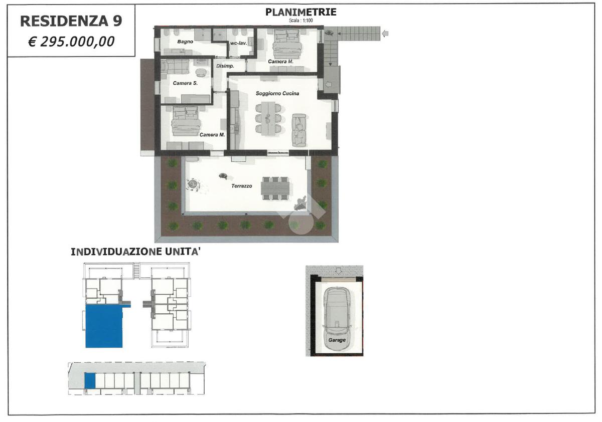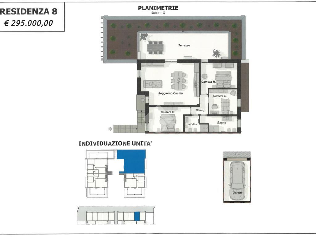 Ogni appartamento è composto da soggiorno con cucina a vista - 2/3 camere da letto - 2 bagni - giardino privato per i piani terra - ampia terrazza per i piani primi - garage singolo e posto auto di proprietà.